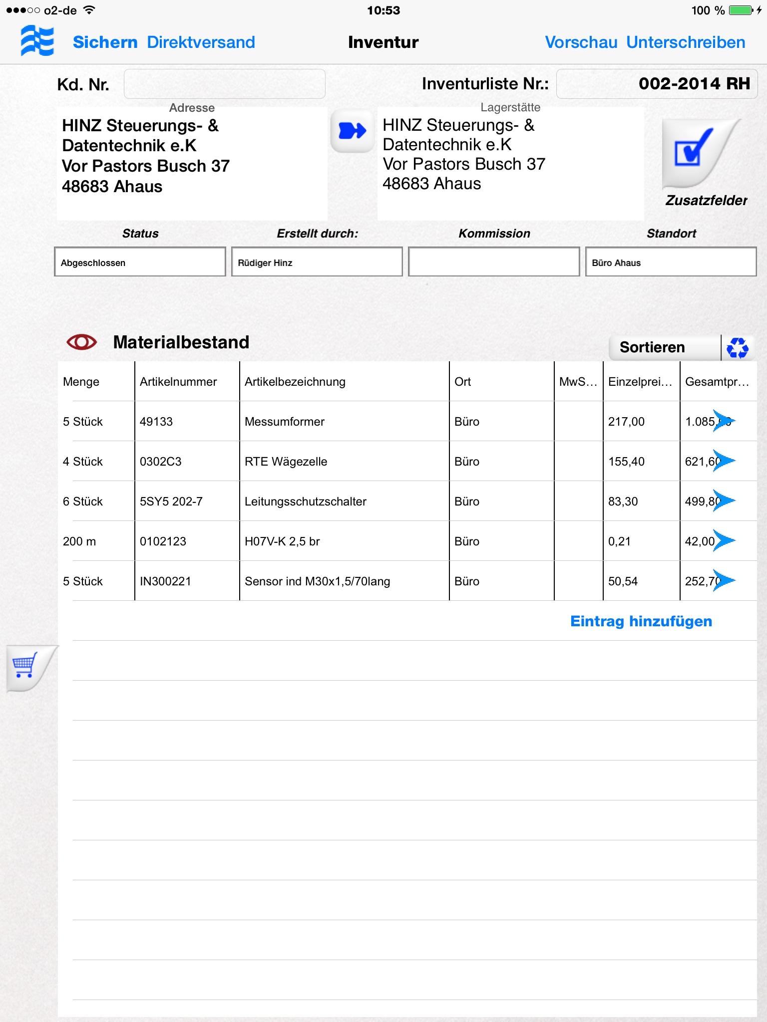 Erfassen Sie aus der Materialdatenbank alle Artikel und Stundensätze und erstellen Sie Ihre Inventurliste.